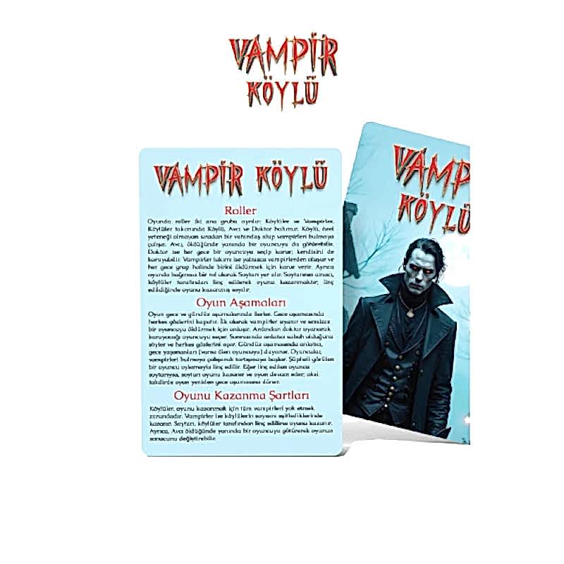 Vampir Köylü, kalabalık arkadaş gruplarının vazgeçilmezi olan, strateji, ikna kabiliyeti ve gizem dolu bir sosyal akıl yürütme oyunudur. Sisli bir kasaba atmosferinde geçen bu oyunda oyuncular; Köylü, Vampir, Doktor, Avcı veya Soytarı gibi farklı rollere bürünerek hayatta kalma mücadelesi verirler. Oyunun temel amacı, köylülerin aralarına sızmış vampirleri gün yüzüne çıkarması; vampirlerin ise kimliklerini gizleyerek her gece birer birer köylüleri saf dışı bırakmasıdır. Karanlık ve gotik görsel tasarımıyla oyuncuları anında atmosferin içine çeken bu kart oyunu, psikolojik analiz ve blöf yeteneğinizi en üst seviyeye taşır.